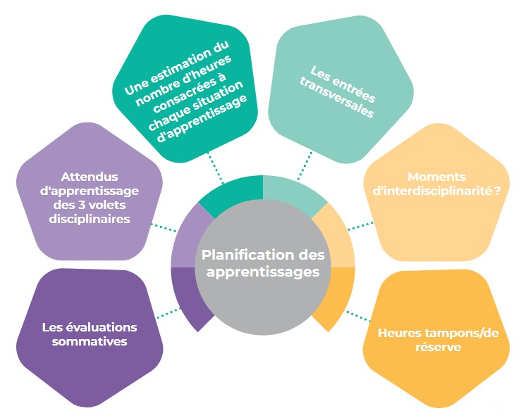 L’ensemble des attendus d’apprentissage liés à chaque volet disciplinaire doit être appris. En fonction de projets interdisciplinaires, de sorties de terrain, de l’actualité, de manière générale en fonction des dispostifs pédagogiques choisis, l’enseignant.e pourra accorder plus ou moins de temps à certains apprentissages.